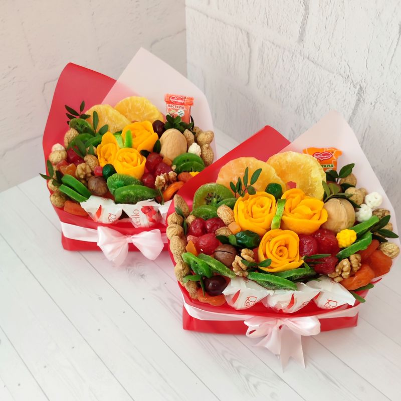 | Материалы | Флористические материалы, сухофрукты, манго, курага, финики, ананас, киви, помело, вишня, кумкват, арахис, арахис в глазури, пастила, конфеты Рафаэлло. | |