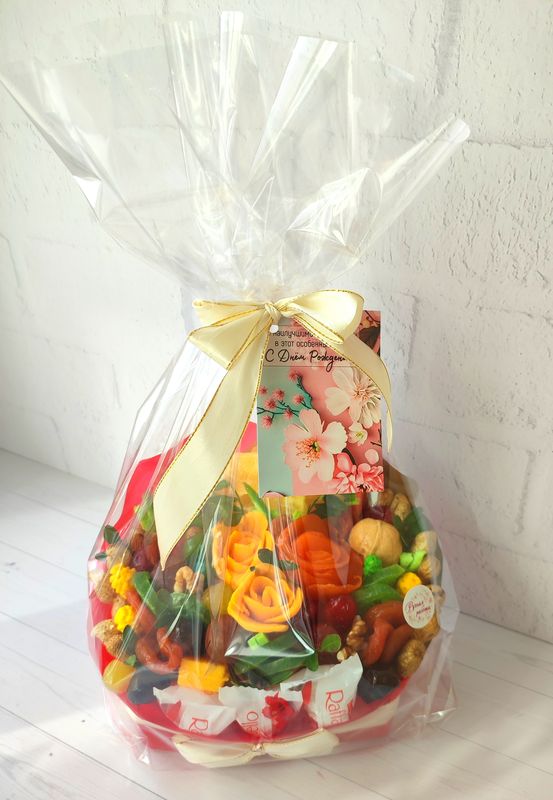| Материалы | Флористические материалы, сухофрукты, манго, курага, финики, ананас, киви, помело, дыня, вишня, кумкват, арахис в глазури, миндаль, пастила, конфеты Рафаэлло. | |