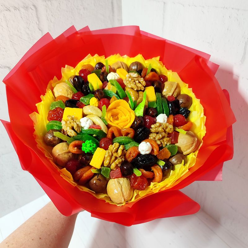 | Материалы | Флористические материалы, сухофрукты, инжир, помело, манго, вишня, кизил, курага, киви, чернослив, орехи, арахис в глазури, кумкват, финики, грецкий орех. | |