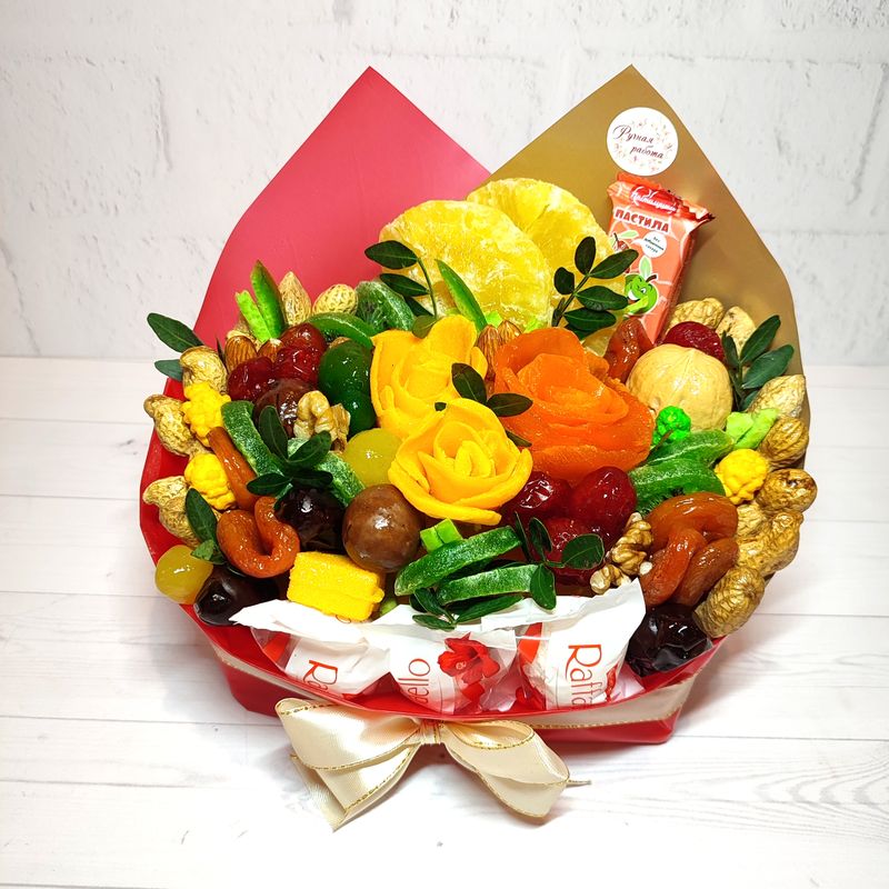| Материалы | Флористические материалы, сухофрукты, манго, курага, финики, ананас, киви, помело, дыня, вишня, кумкват, арахис в глазури, миндаль, пастила, конфеты Рафаэлло. | |