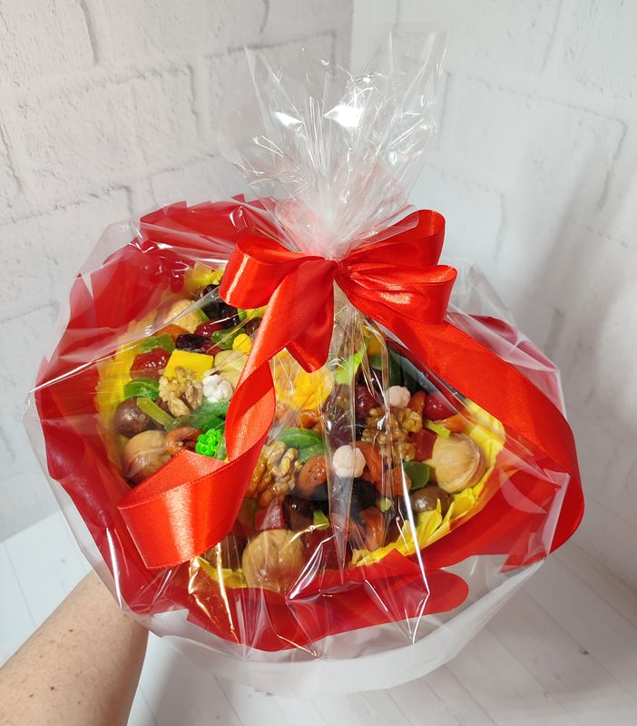 | Материалы | Флористические материалы, сухофрукты, инжир, помело, манго, вишня, кизил, курага, киви, чернослив, орехи, арахис в глазури, кумкват, финики, грецкий орех. | |